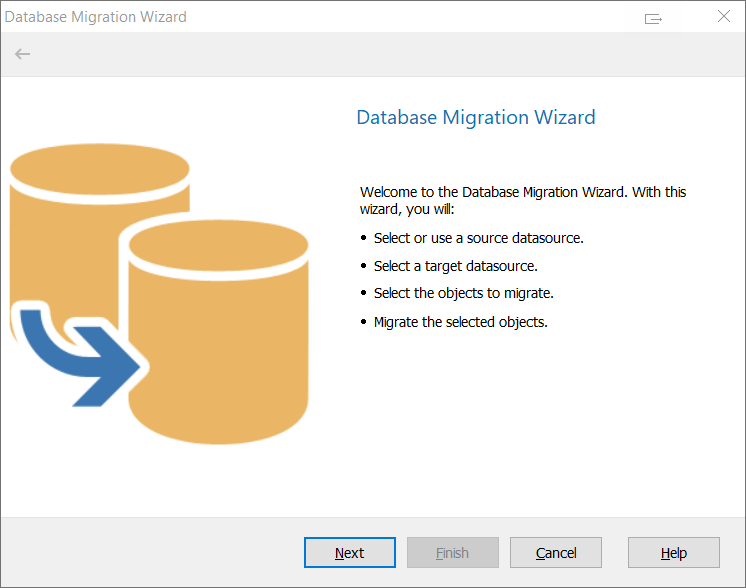 The Database Migration Wizard lets you choose a source and destination for your migration.