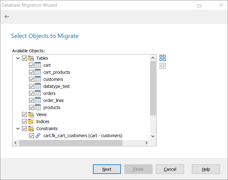 Next it will allow you to select objects suitable for migration. When migrating between different database systems, you won't be able to select all possible object types.