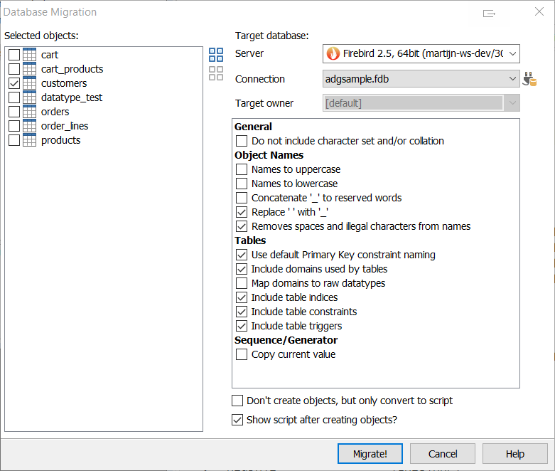 Use the options to fine tune migration or object selection and optionally create the objects directly or just generate a valid SQL script.