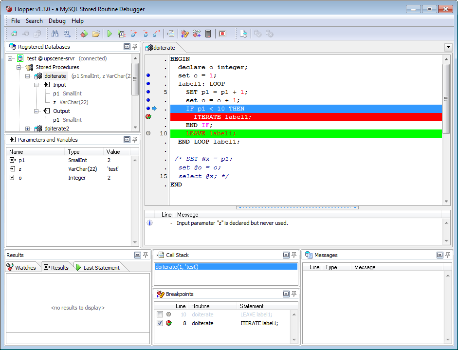 Hopper is a standalone tool to debug database stored code, like Stored Procedures and Triggers even though InterBase, Firebird and MySQL don't provide a debugging API.
