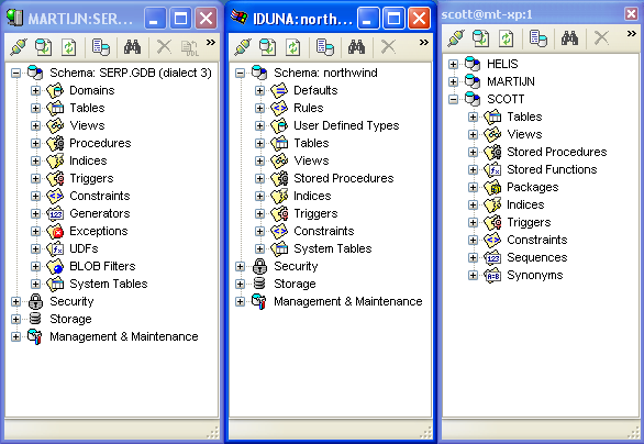 Two Database Navigators - InterBase on the left, MS SQL Server in the middle and Oracle on the right The tree-view of the Database Navigator can have up to 4 main schema specific tree nodes: