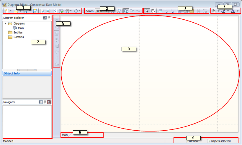 The Diagram Explorer area gives you a lists of the available diagrams (the main diagram and optional sub-diagrams), Entities and Domains or Tables, Views and Domains as available in the different model types.