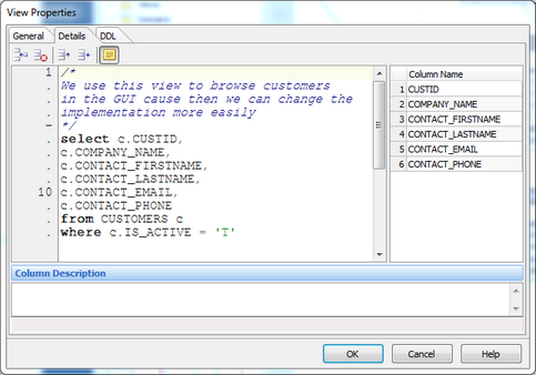 On the DDL tab, you can view the SQL statement needed to create the view, or to modify an existing view after you've modified the column properties in the dialog.