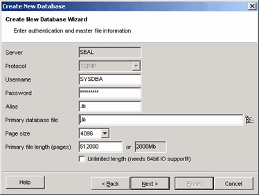 The Create New Database Wizard - page 2 - login and primary datafile info
