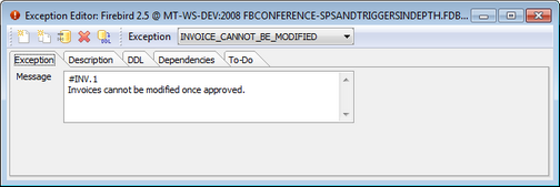 For the database engines that support user-defined exceptions as declared objects, Database Workbench has an Exception Editor that you can use to create, alter and drop exceptions.