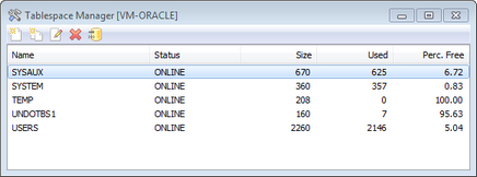 You can reach the Tablespace Manager via the Enterprise Manager and the Storage. Double clicking the Tablespaces node will open a window similar to the one below.