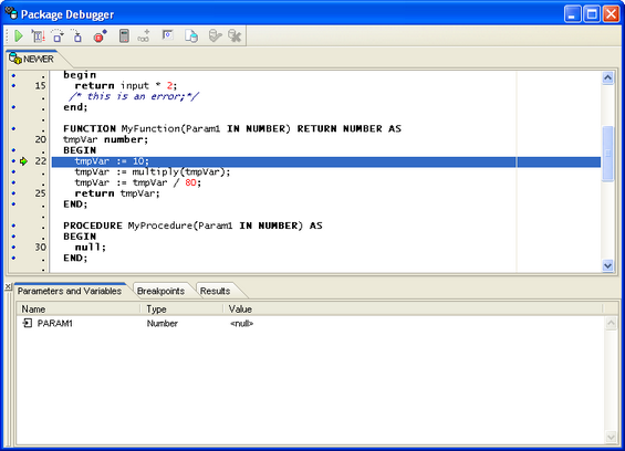 Note: •The Oracle debugger in Database Workbench does not support the following debug windows: Watches, Last Statement and Messages. •The Oracle debugger doesn't pick up variable names for a routine, you can manually define them by selecting a variable name in the code window, using the context menu and selecting Add Variable. This will create an entry in the Parameters & Variables debug window. |