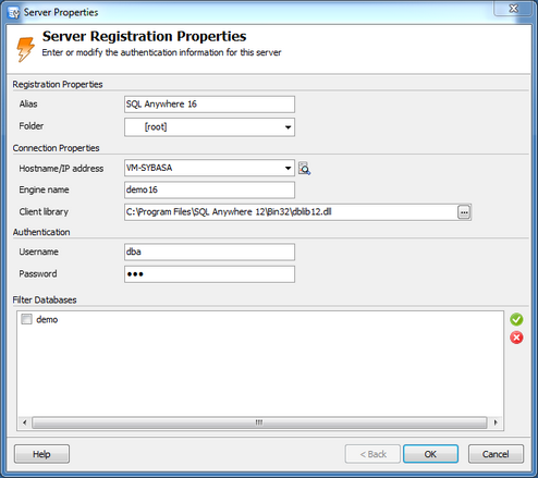 In order to register a Sybase Anywhere server, you need to fill out the dialog below, reached via the Enterprise Manager and the Register Server button.