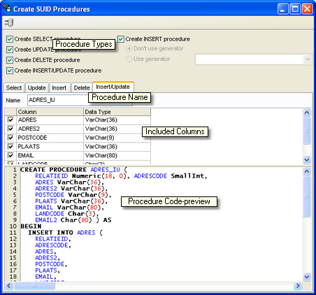 SUID procedures - Select, Update, Insert and Delete procedures - can be very easily created by using the context menu from the Database Navigator and selecting Create SUID Procedures.