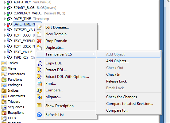 VCS Context MenuIn the context menu the TeamServer VCS sub menu adds functionality: 1.Add Object 2.Add Objects 3.Check Out 4.Check In 5.Release Lock 6.Break Lock 7.Check for Changes 8.Compare to Latest Revision 9.Compare to...