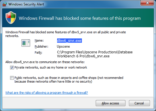 The first startWhen starting Database Workbench for the first time, Windows Firewall or a 3rd party Firewall application might popup a warning similar to this: