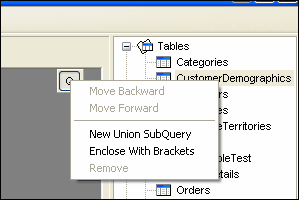 UnionsThe editor also allows you to create UNION-queries. If you right click the Q and select New Union SubQuery. You can switch between the first and additional parts of the query by clicking the different Qs.