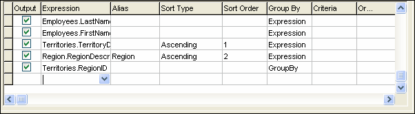 Grouping/Functions/SortingAt the bottom part of the Visual Query Builder dialog, the Columns section lists any sorting, grouping or other SQL functions like AVG on a per column basis. Columns, Grouping, Functions and Sorting