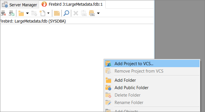 Adding a database project to the VCSIn order to start this, add the database to the VCS on the Workspace tab in the Database Navigator. Use the context menu and select Add Project to VCS.