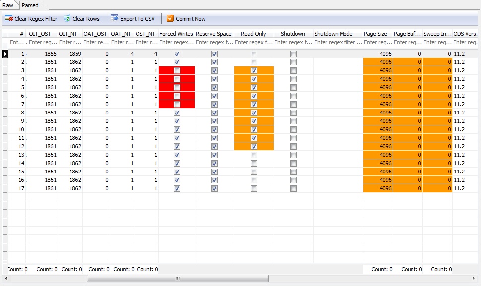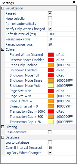 This makes it easy to read and furthermore, FB TraceManager also provides "derived" attributes, like the gaps/differences between the various transaction counters as shown above in the OIT_AT, OIT_OST, OIT_NT, OAT_OST, OAT_NT and OST_NT columns. A customizable color management facility, with meaningful default-settings, underlines suspicious database settings (e.g. Forced Writes = OFF etc.).