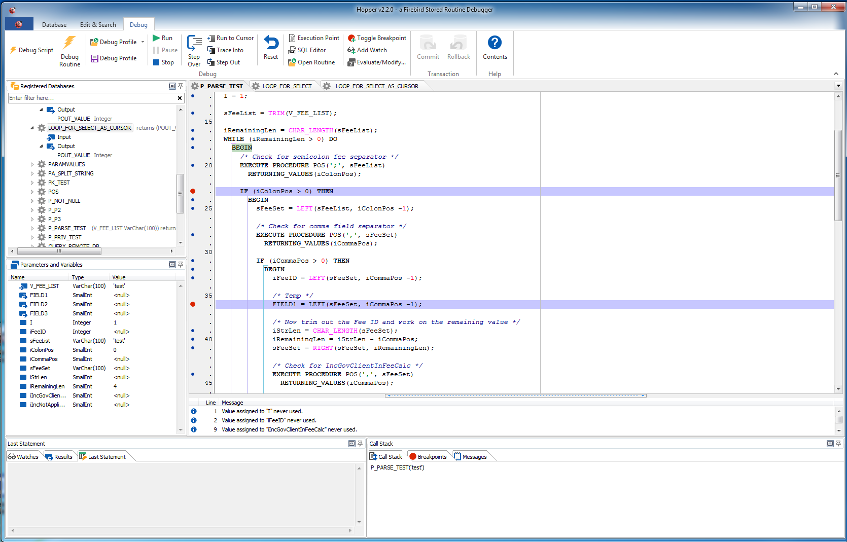 Upscene Productions is proud to announce version 2.4.0 of "Hopper", a stored routine debugger for InterBase, Firebird and MySQL. You can debug stored procedures, packages, stored functions and triggers.